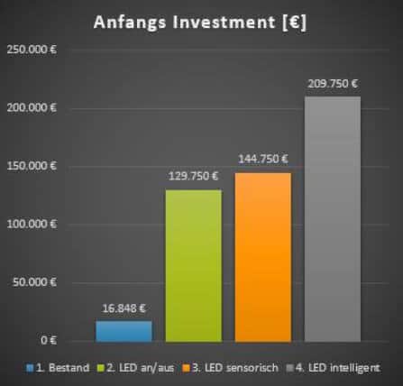 Die Implementierung des intelligenten LED-Systems ist im Vergleich vor allem zur einfachen, ungesteuerten LED-Anlage deutlich kostenintensiver. Doch näheres Hinsehen lohnt sich. Dazu ist es meist nur notwendig die gesamten Kosten über die ersten 5 Jahre zu betrachten!