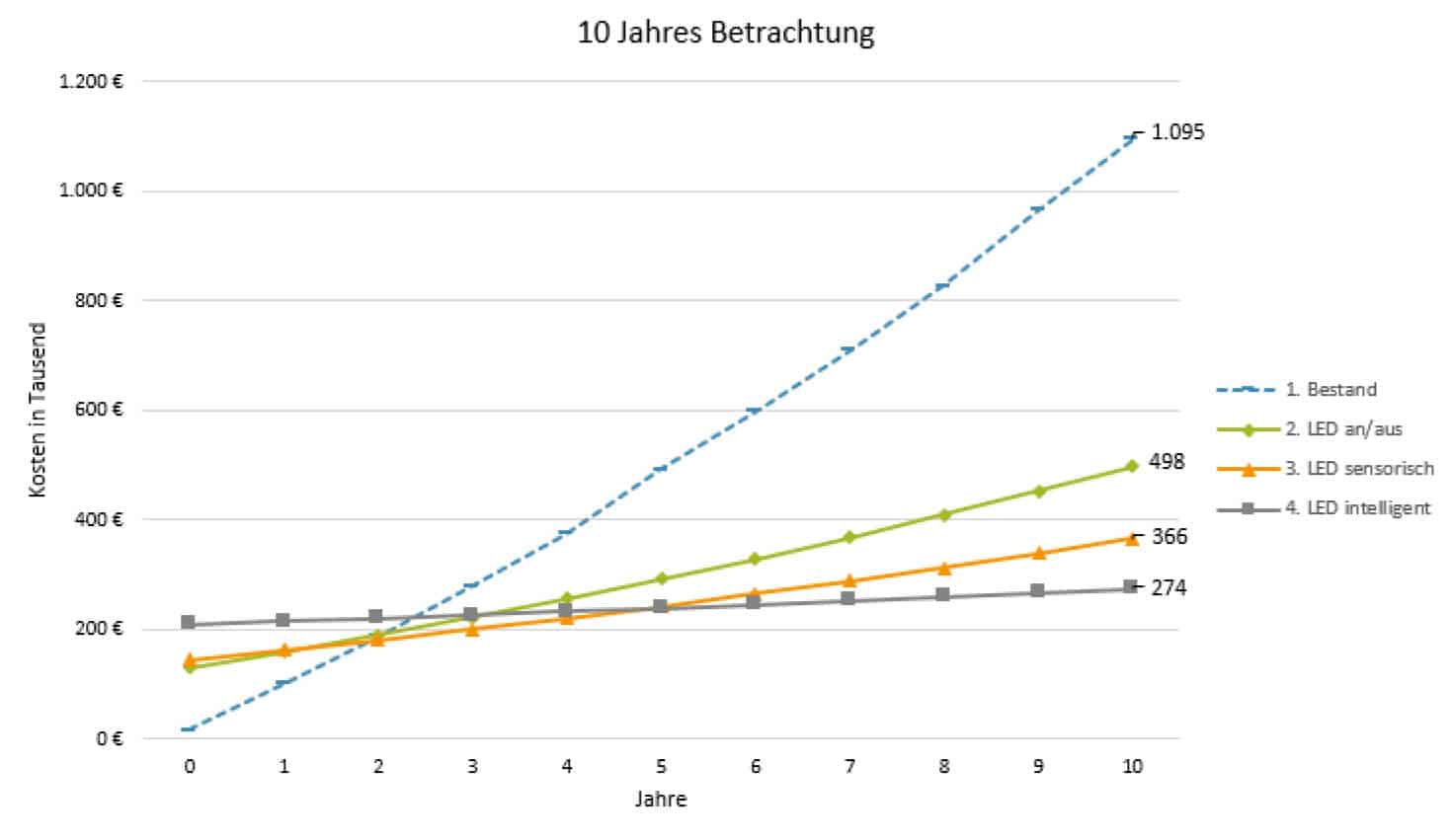 Bei der Betrachtung gehen wir davon aus, dass zu Beginn der Implementierung alle Leuchtmittel im Bestand einmal erneuert werden. Dies macht man, damit alle Varianten einen gemeinsamen Startpunkt haben. Die Kosten setzen sich aus den Preisen der Leuchtmittel und denen der Montage zusammen. Nach Ablauf der Lebensdauer der Leuchtmittel fallen diese Kosten dann erneut an. Die Steigung der Graphen wird bestimmt durch die Verbrauchs- und Wartungskosten.