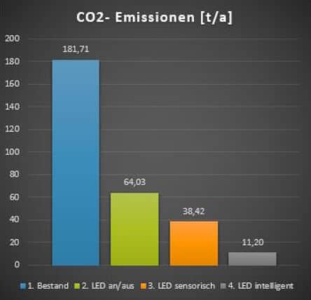 Auch die Kennzahlen der CO2-Emission sind von besonderer Bedeutung und nach unserer Meinung auch besonders wichtig. Liegen die Emissionen durch die bestehende ineffiziente Anlage bei über 180 Tonnen pro Jahr, so reduzieren sich diese durch die Verwendung des intelligenten LED-Systems auf lediglich 11 Tonnen – eine Einsparung von über 90%! Die Zahlen belegen den nachhaltigen Impact eines intelligenten LED-Beleuchtungssystems in aller Deutlichkeit.