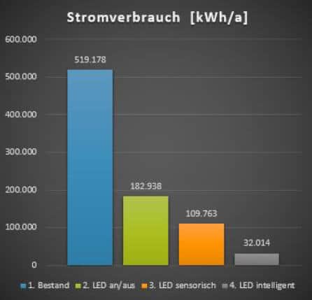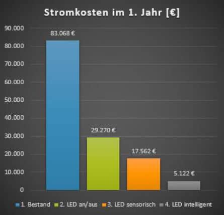 Bei der allgemeinen Betrachtung des Stromverbrauchs wird deutlich, die größten Kosten verursacht hier eindeutig die Nutzung vorhandener Beleuchtungsanlagen. Zwischen LED an/aus und einer sensorischen LED-Beleuchtungsanlage, die über Präsenzsensoren geschaltet wird, ist der Unterschied vorhanden, aber relativ gering. Den geringsten Verbrauch verursacht im Vergleich ganz eindeutig die Implementierung eines intelligenten Beleuchtungssystems.